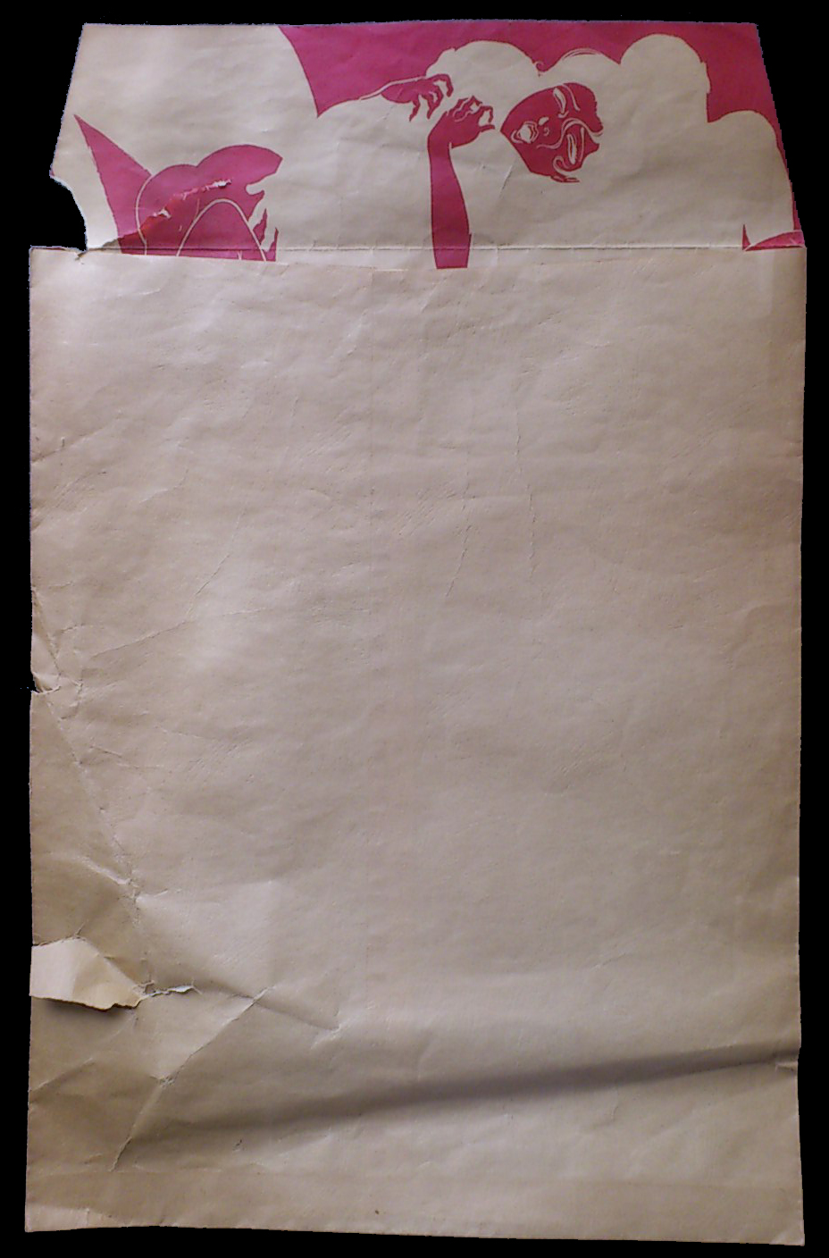 その後、ギャラリーで開催した渚ようこさんのライブにもお越し頂き、その時またまた貴重な品をお持ちいただく。それは先日朋子さんがいらしたときに雑談した原稿袋のこと。今回展示販売している原稿袋の前に確か赤いデザインの袋があったような気がする、とお話したところ、朋子さんはそれをお持ちだとおっしゃる。そしてライブの日に本当に持ってきてくださった。記憶では白と赤だったが、実際は茶封筒の色と赤だった。内側には一代目と同じ男と女のからみ絵が。でも一代目とは微妙にデザインが違う。 名前も入っている。ひょっとしたら幻だったのかもしれないと半分諦めていた二代目の存在をこうして手にすることができて嬉しい。朋子さんありがとうございます。